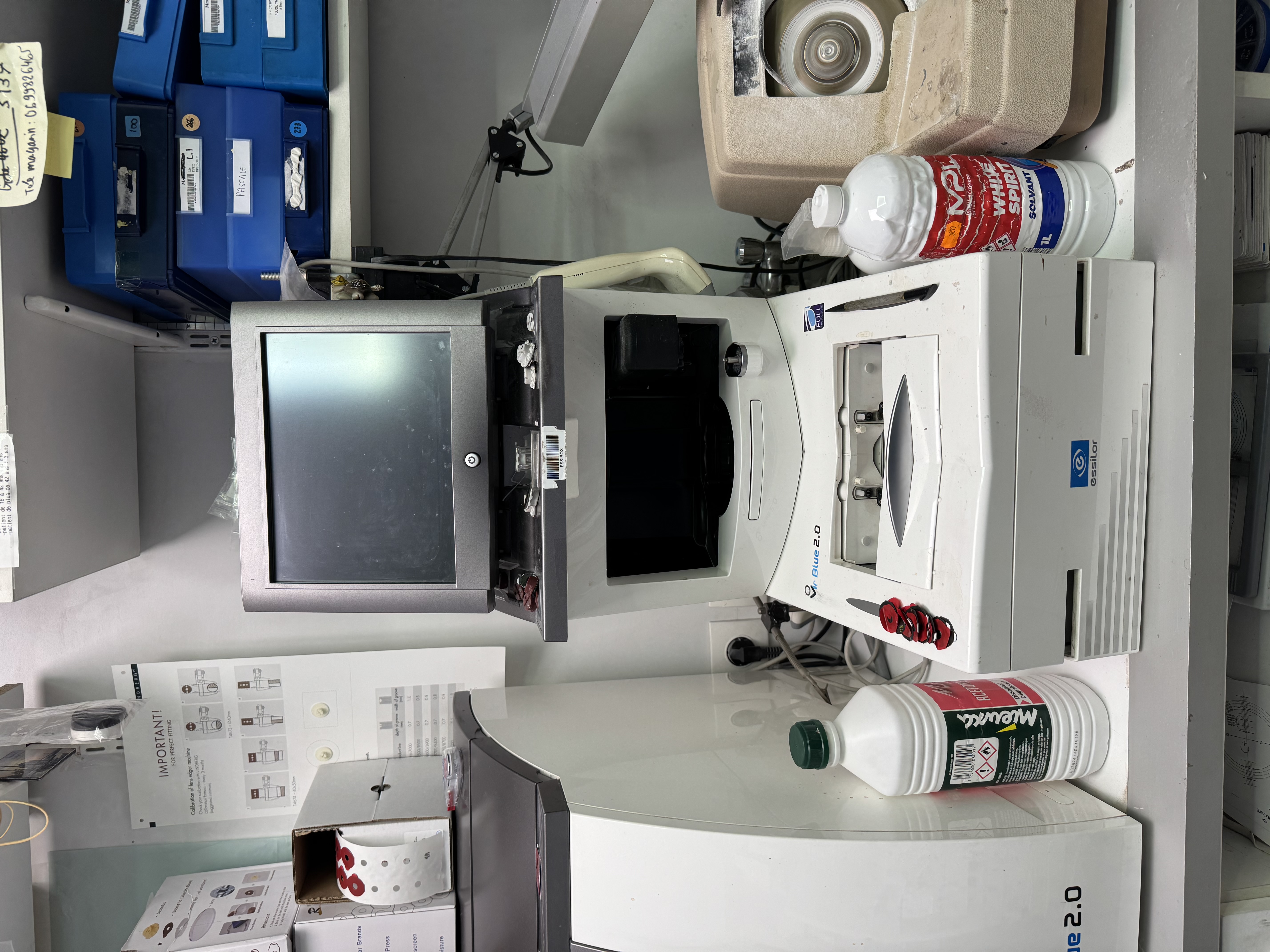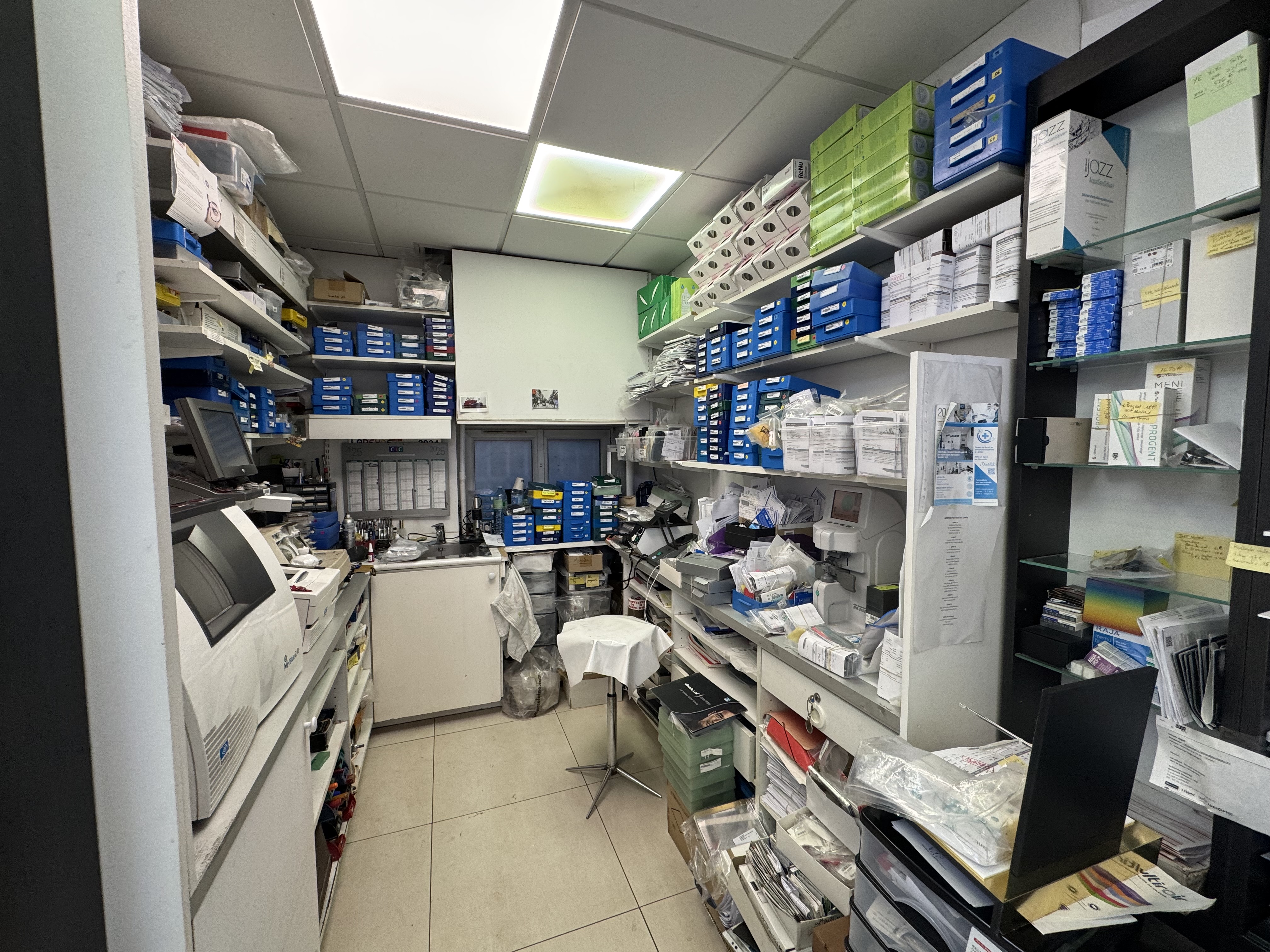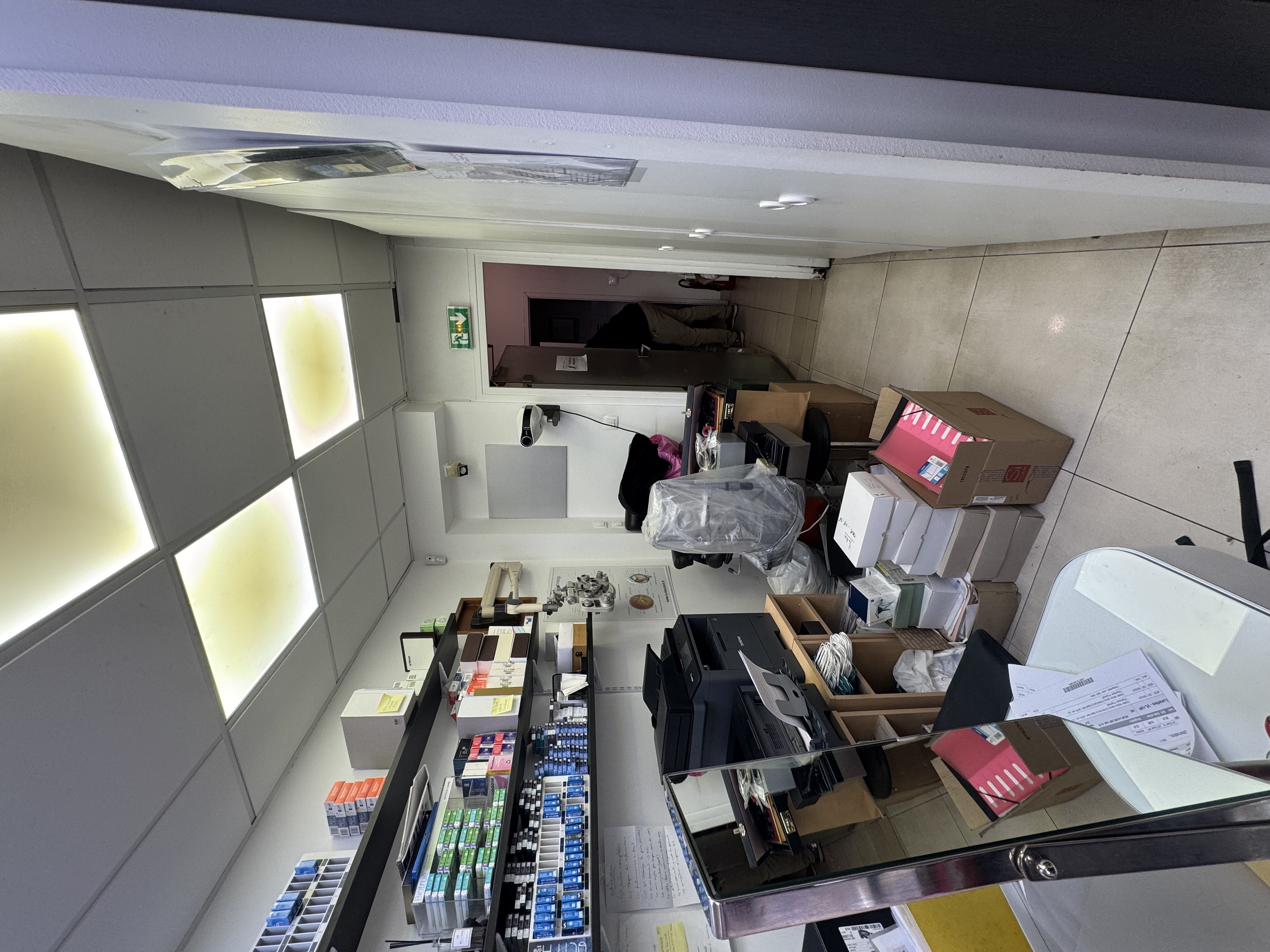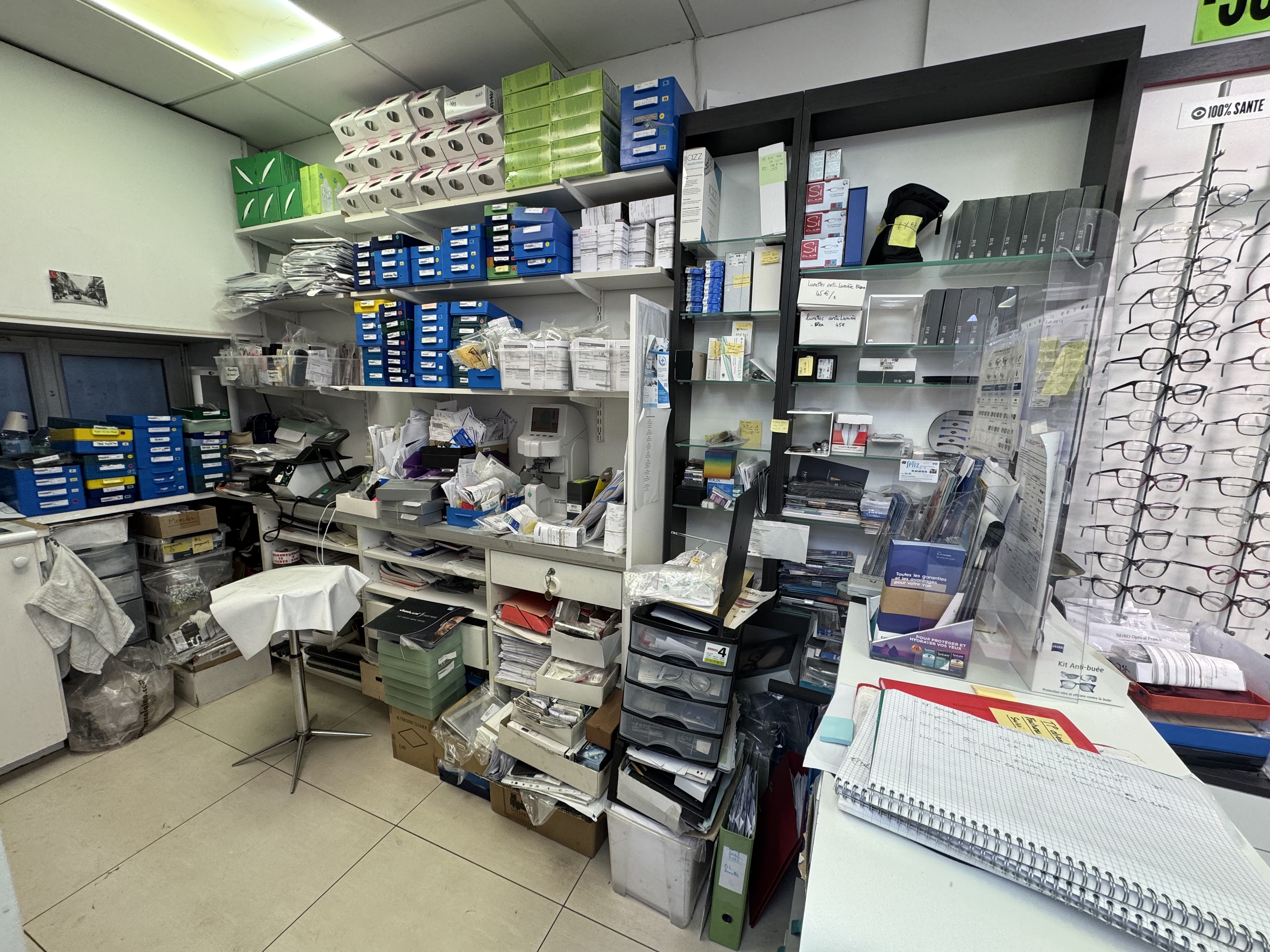 - atelier lunettes, attention au placement des machines, panneau rainurées, table à l'angle pour l'ordi et les machines