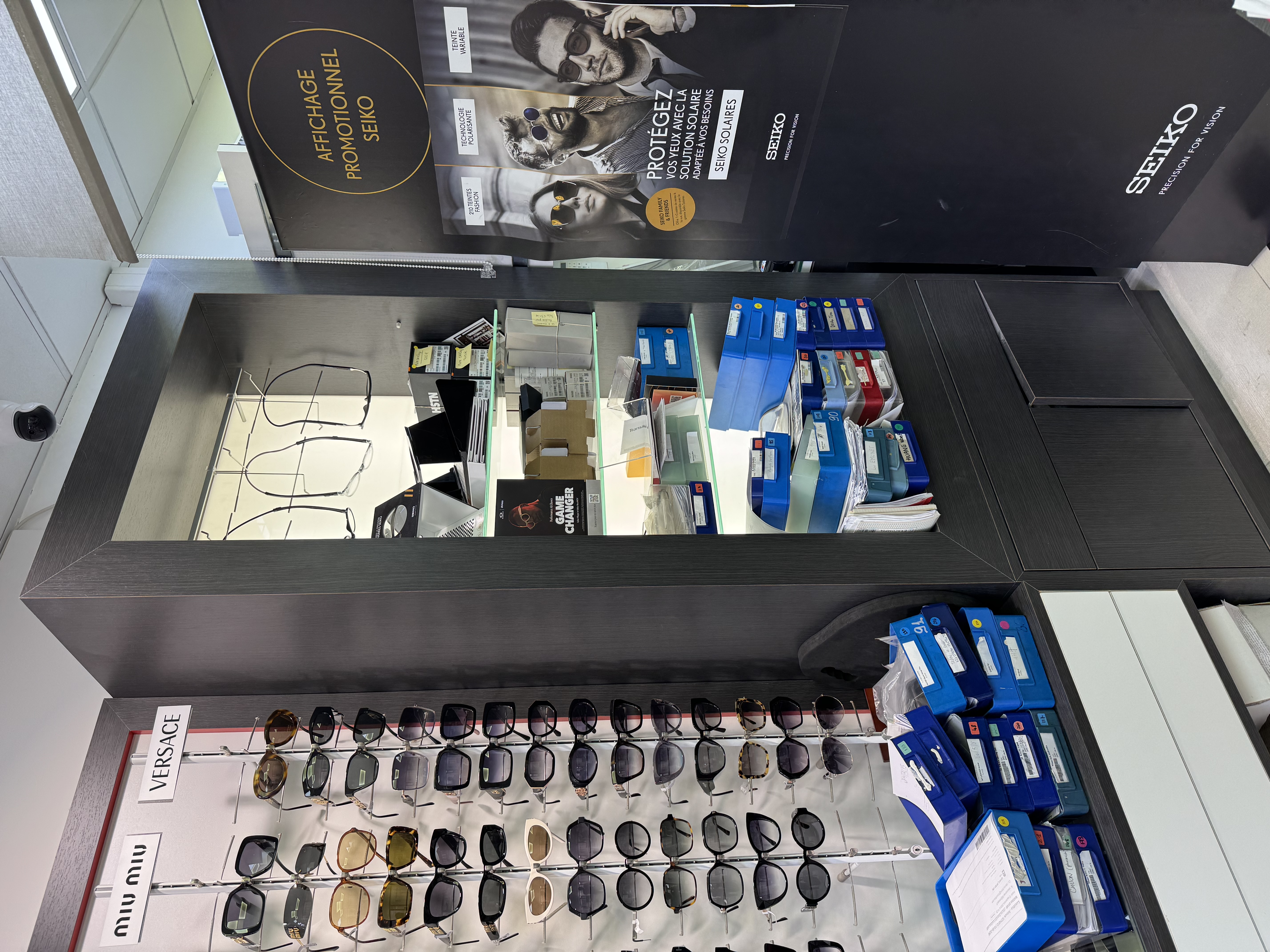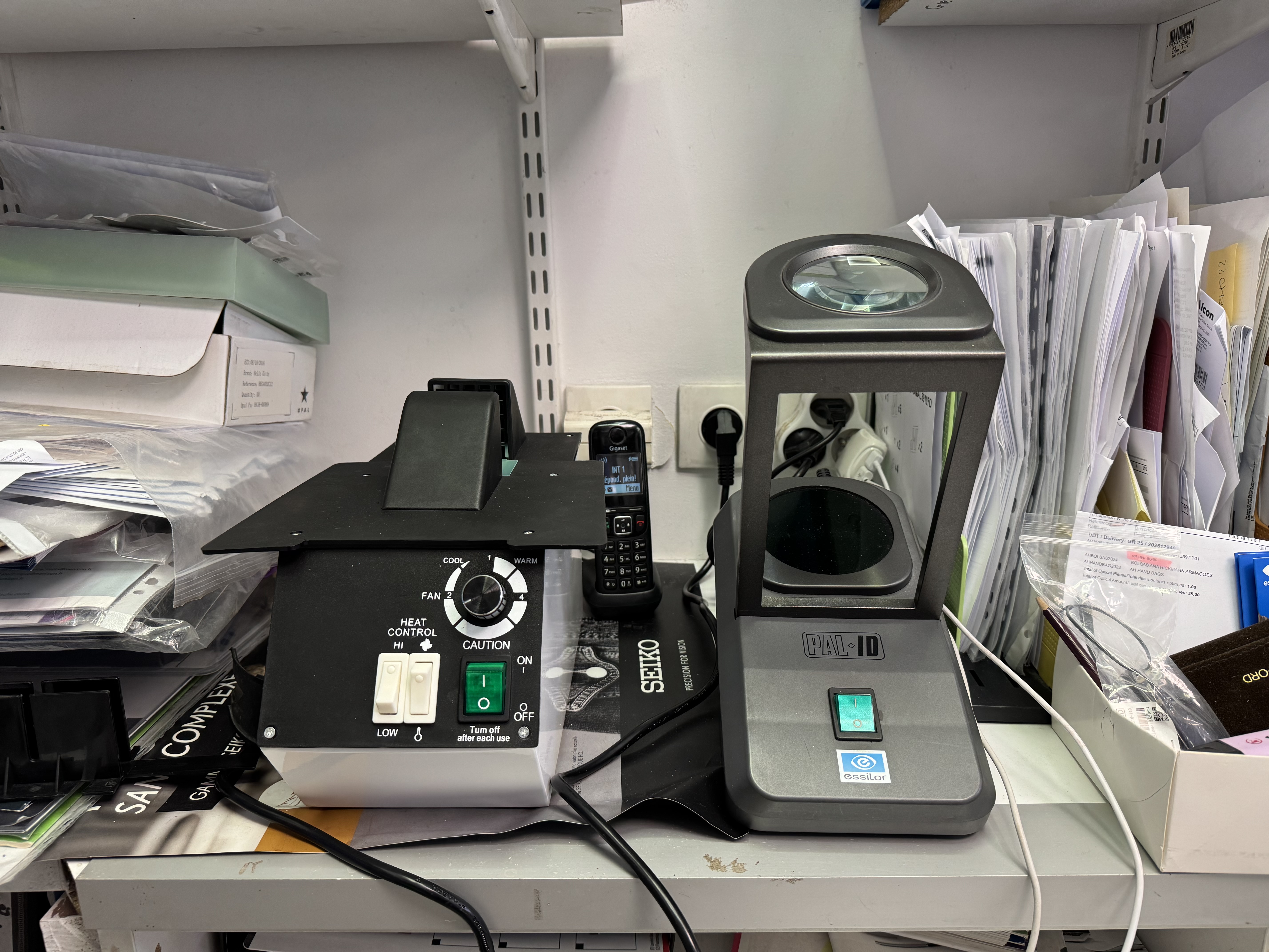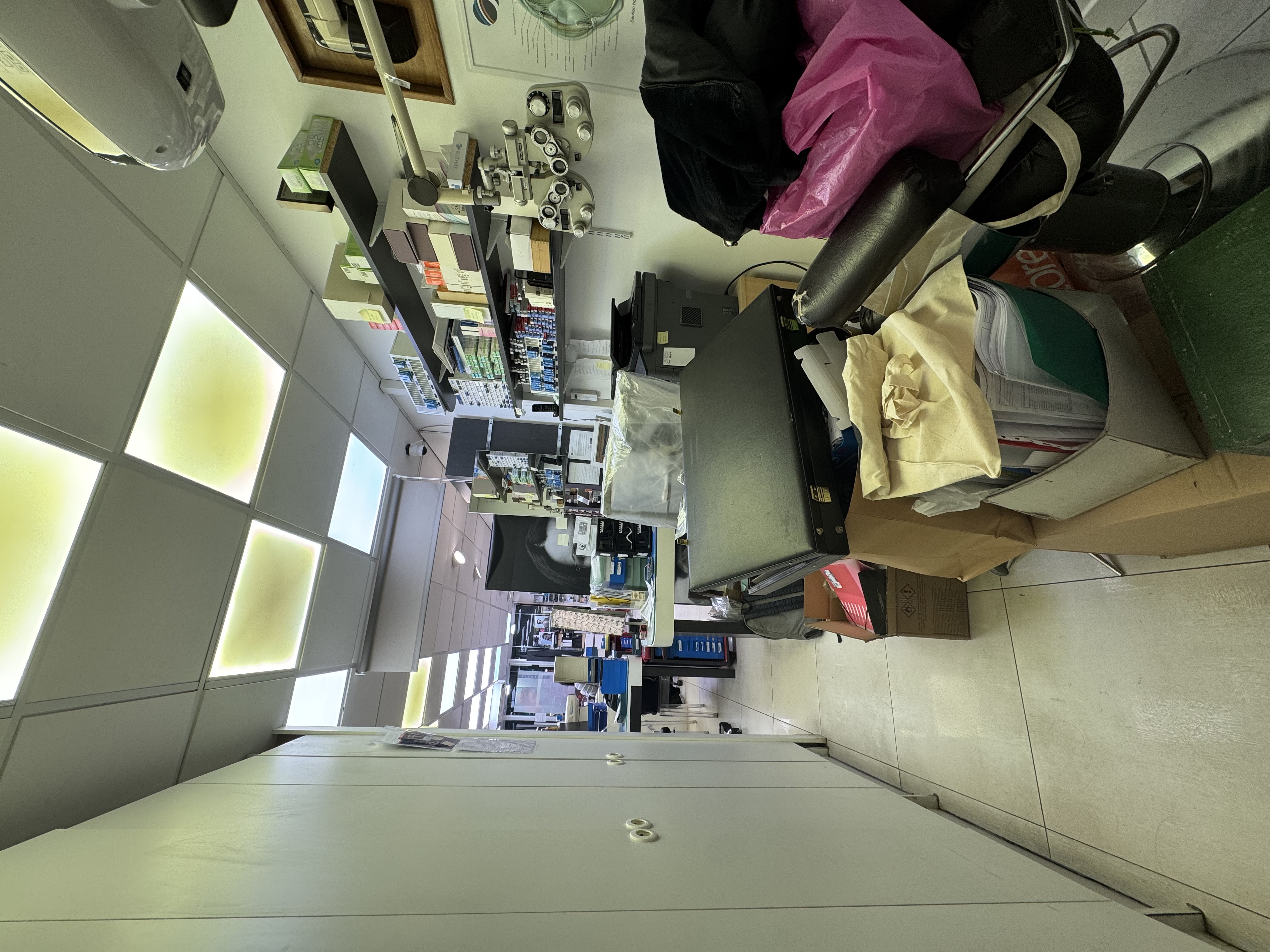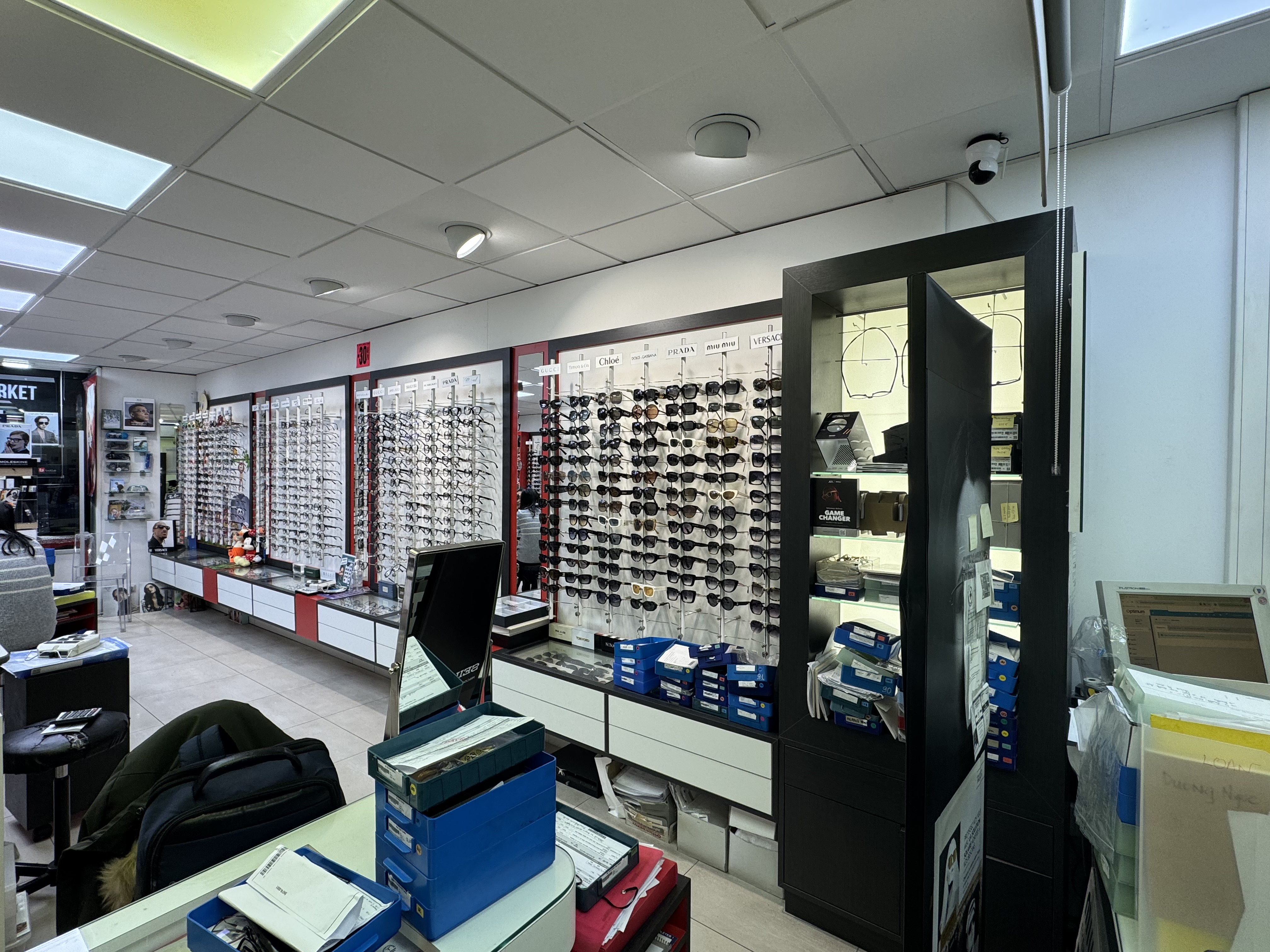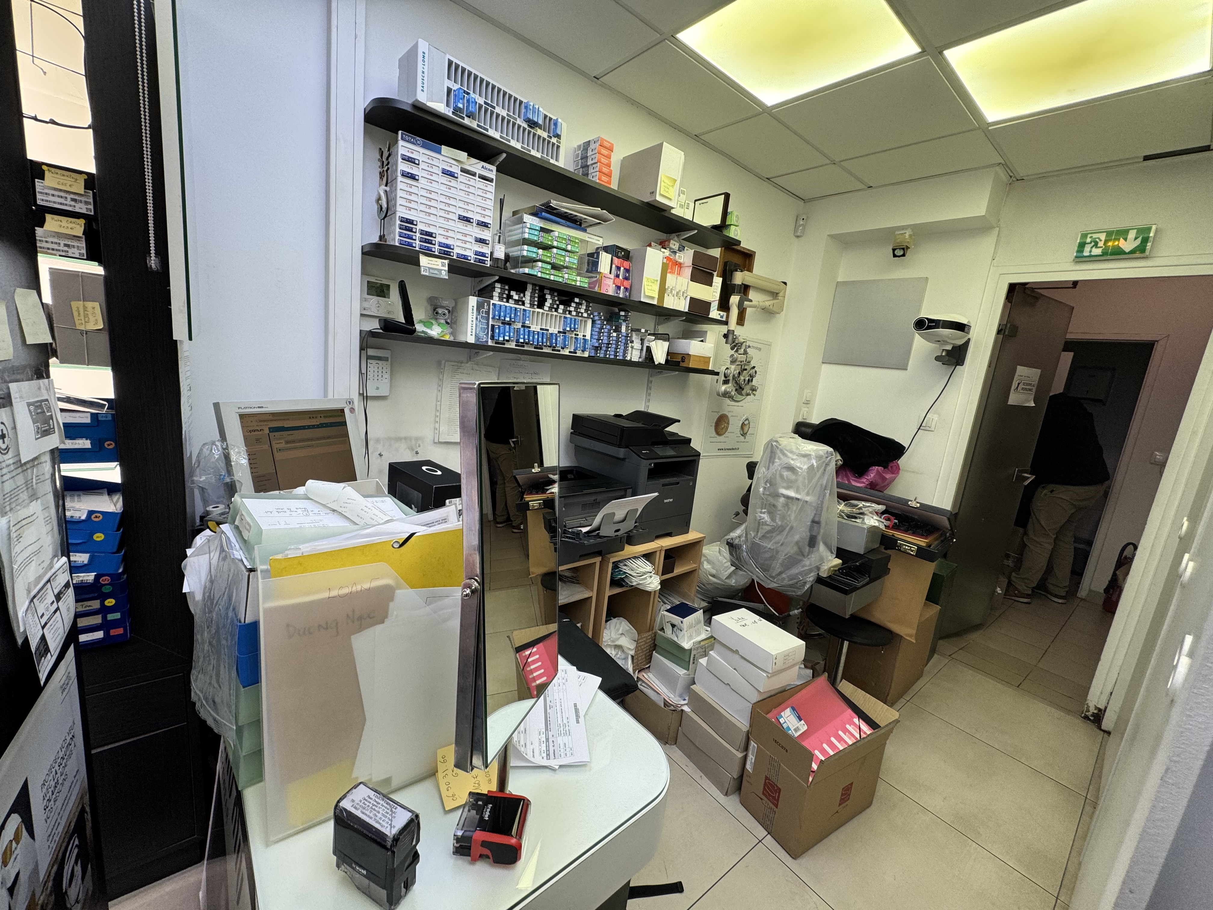 - atelier lunettes, attention au placement des machines, panneau rainurées, table à l'angle pour l'ordi et les machines