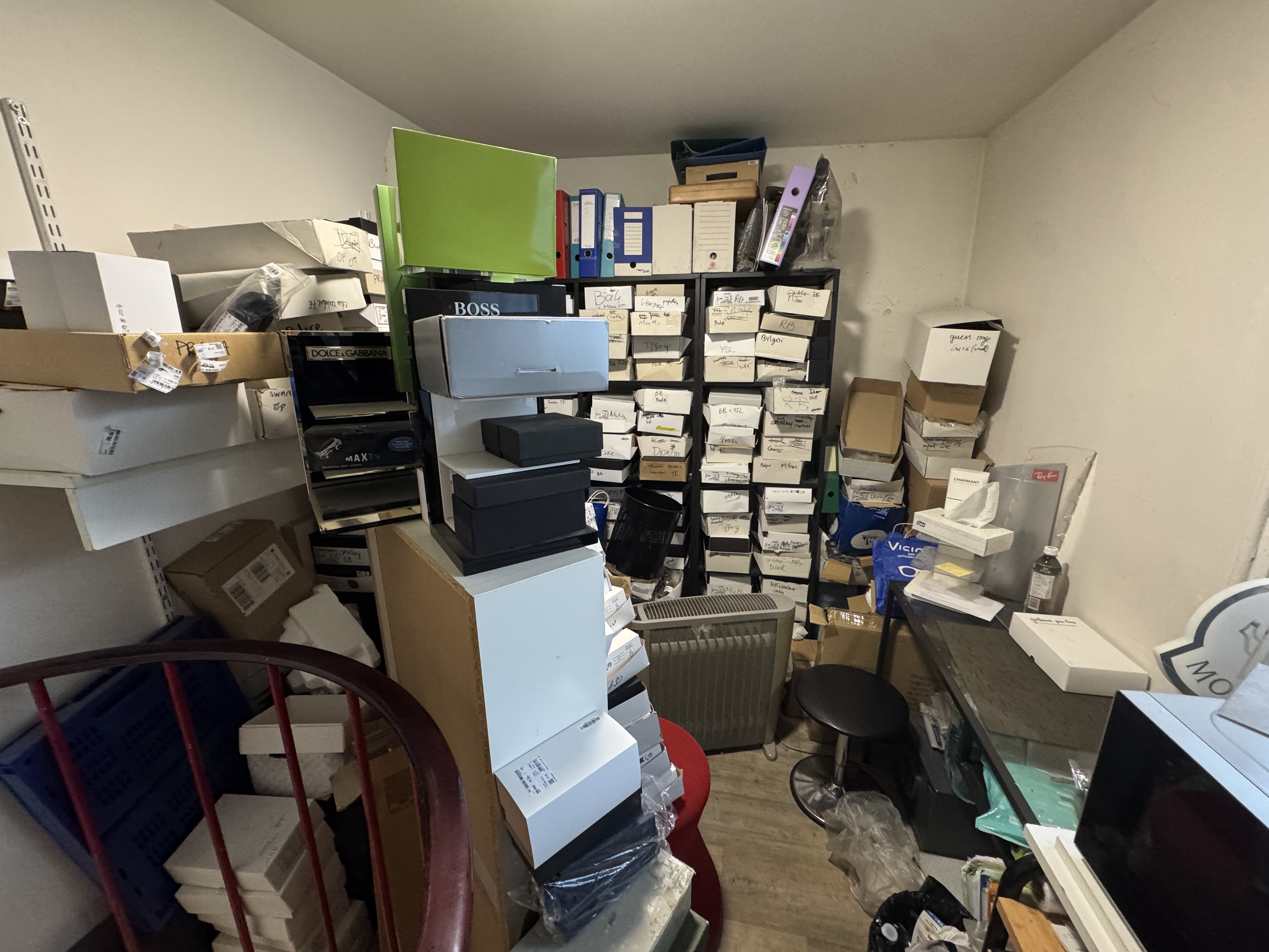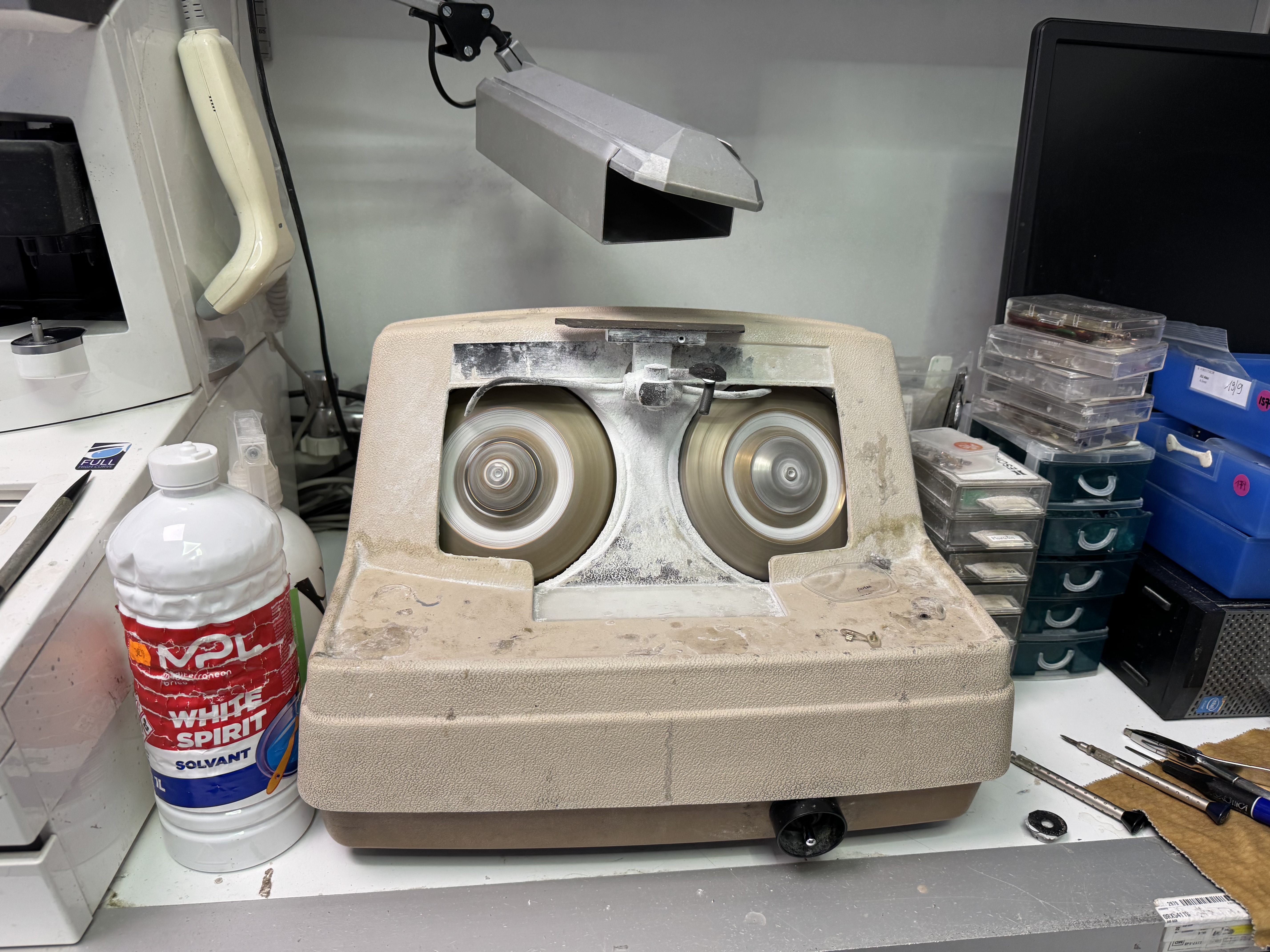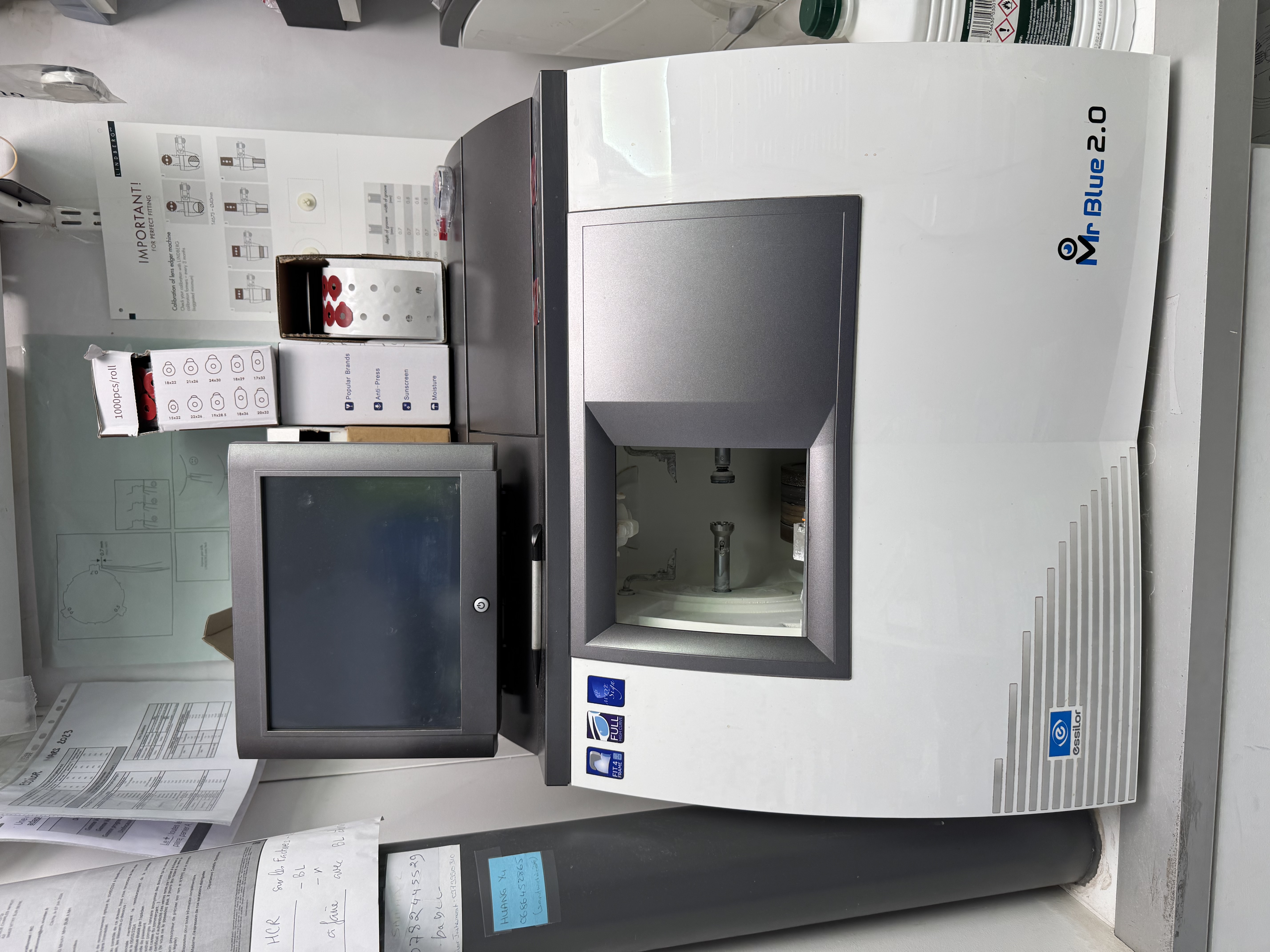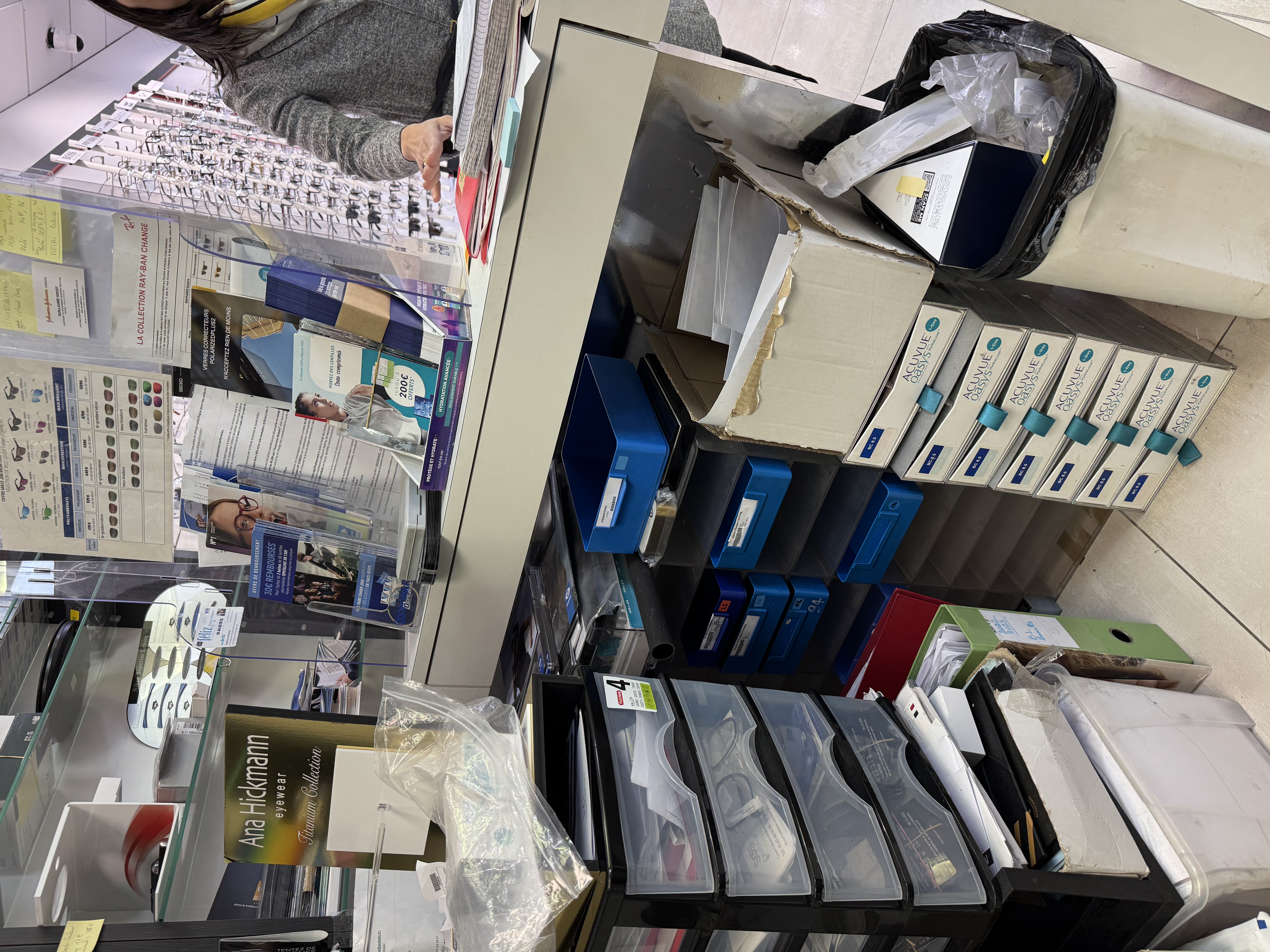 - atelier lunettes, attention au placement des machines, panneau rainurées, table à l'angle pour l'ordi et les machines