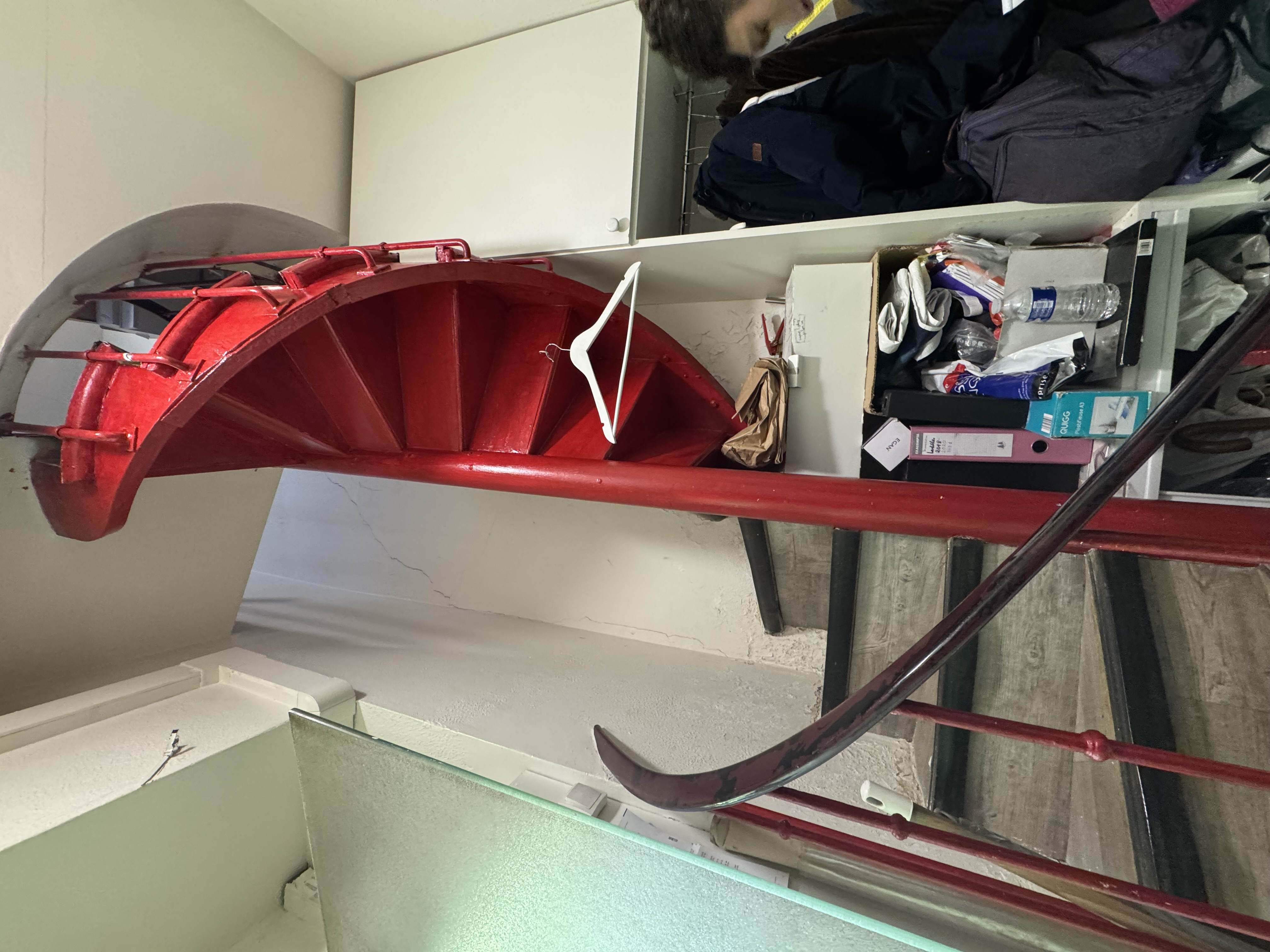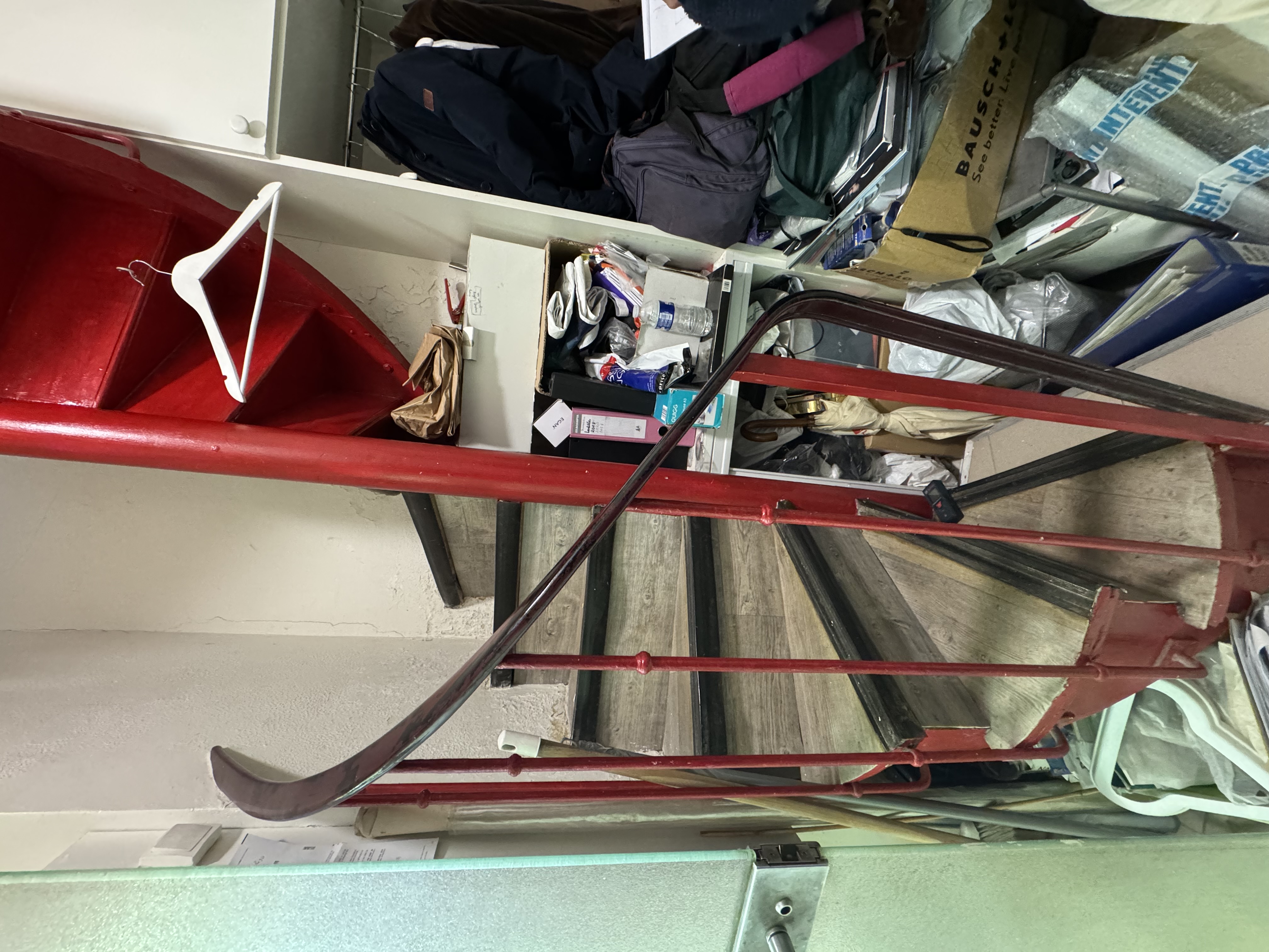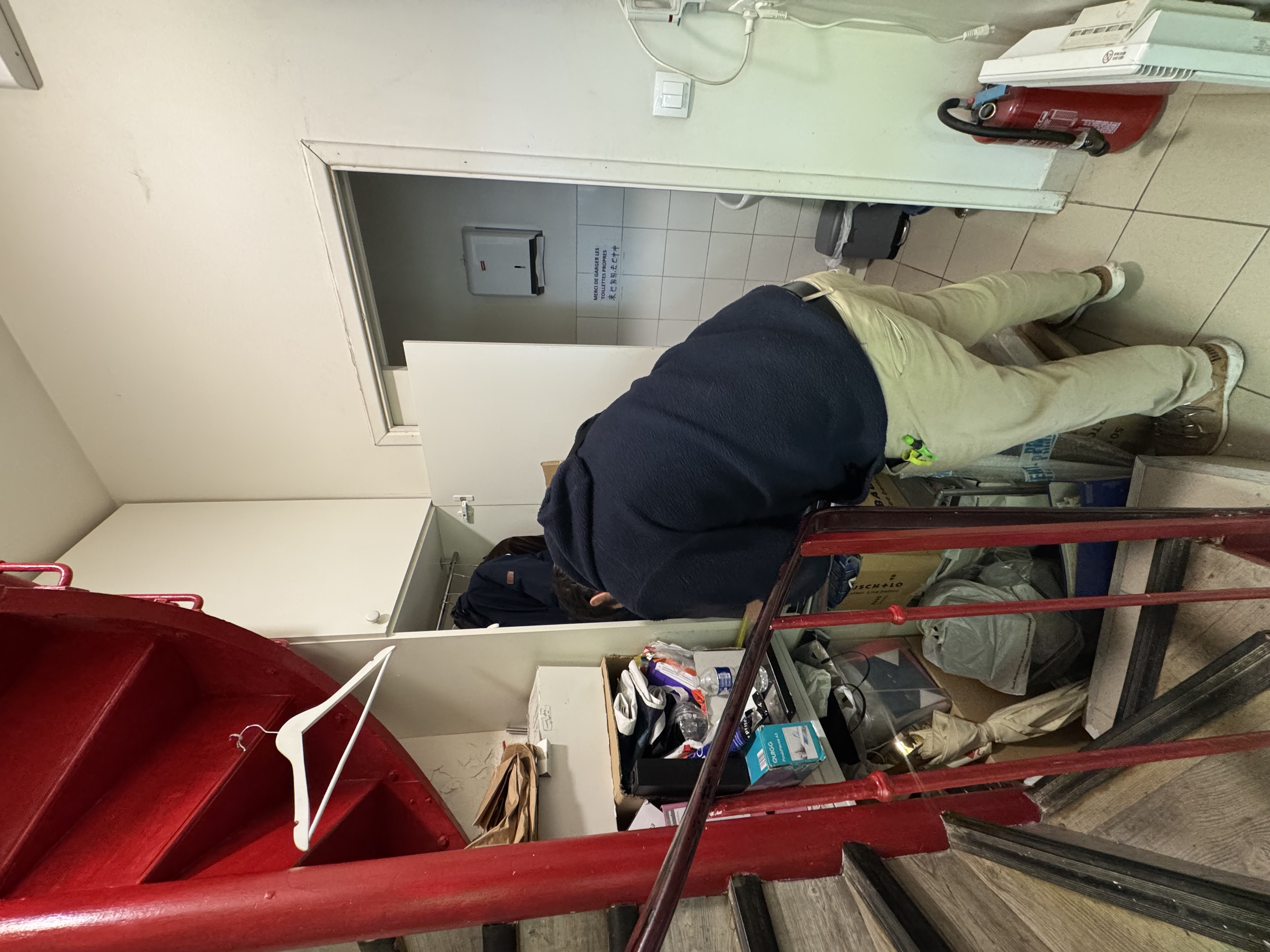 - en bas escalier, mettre un frigo, des armoires de rangement, porte balai, changement verou toilette