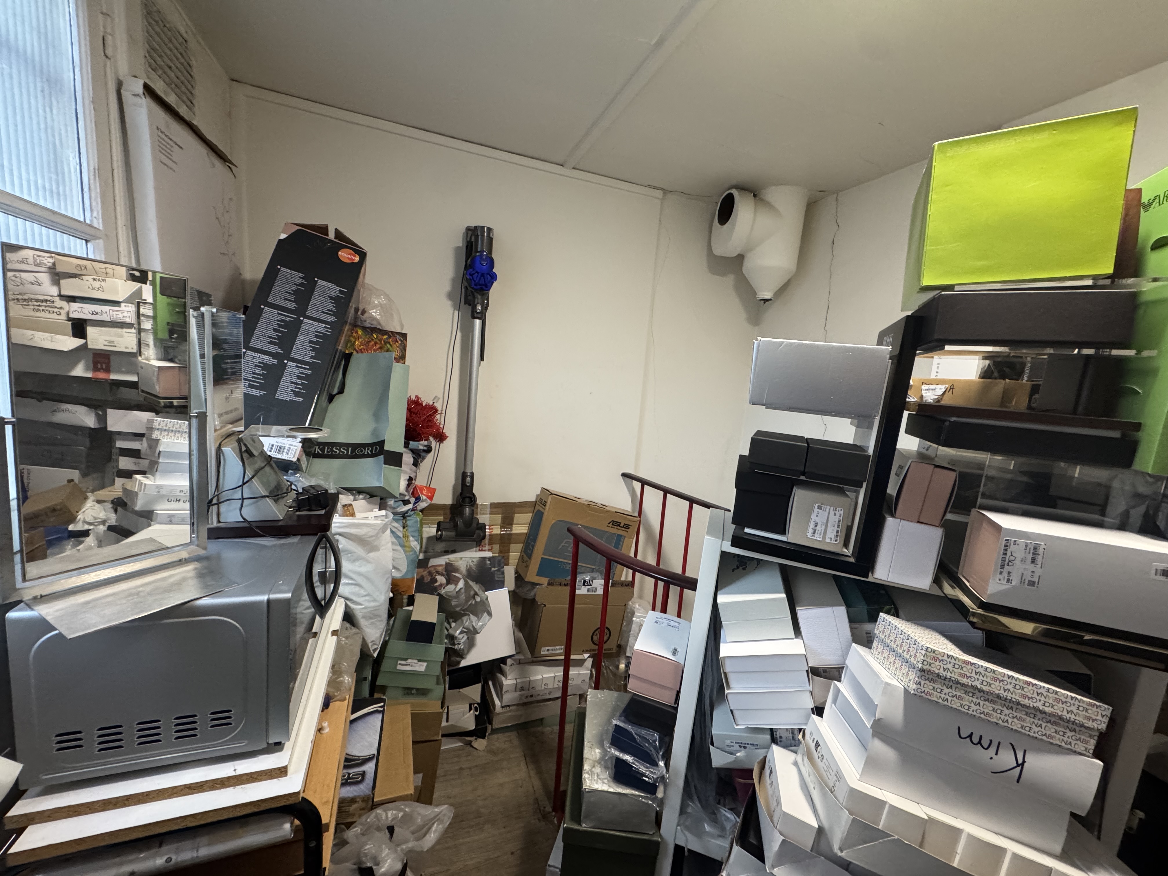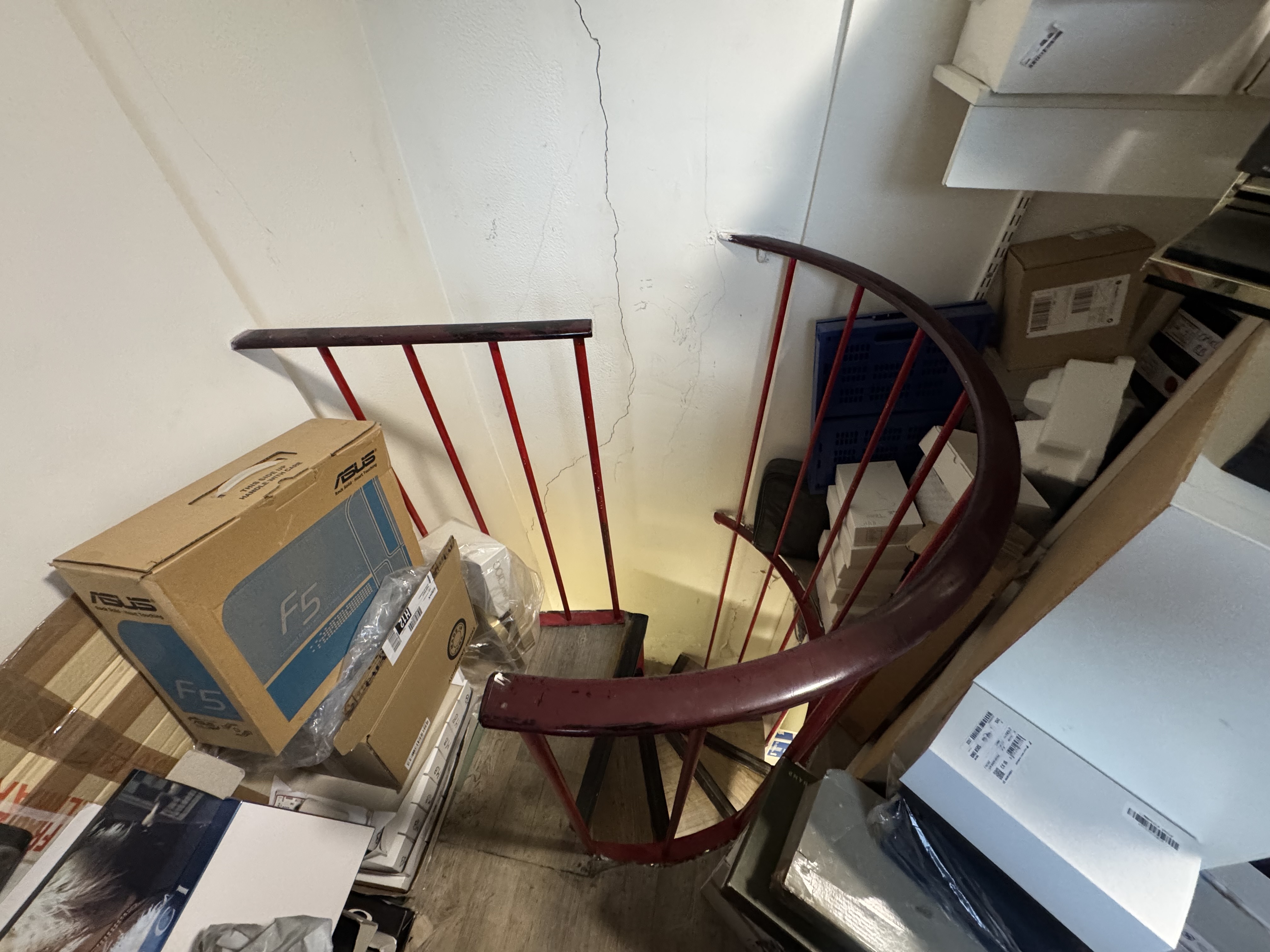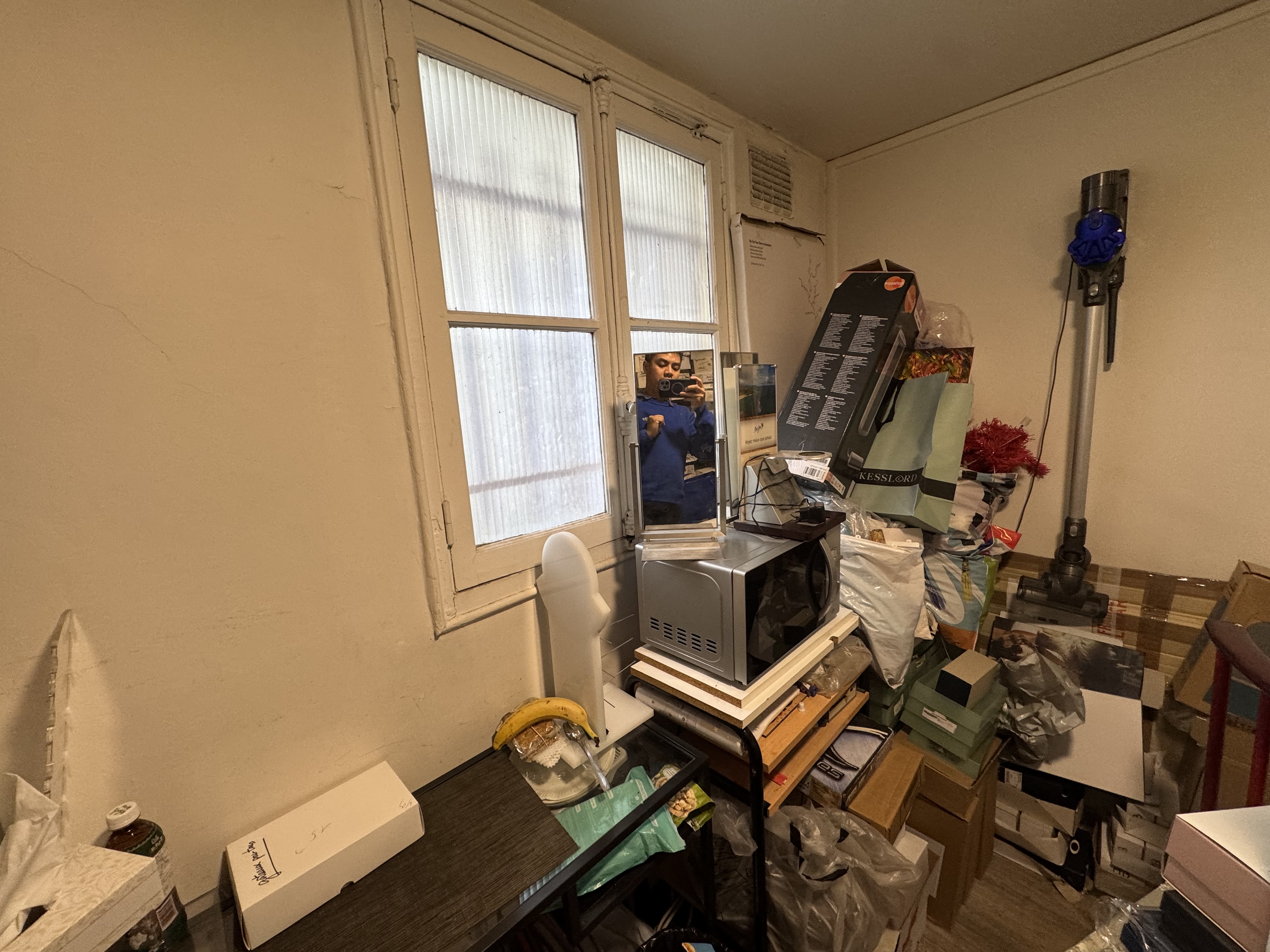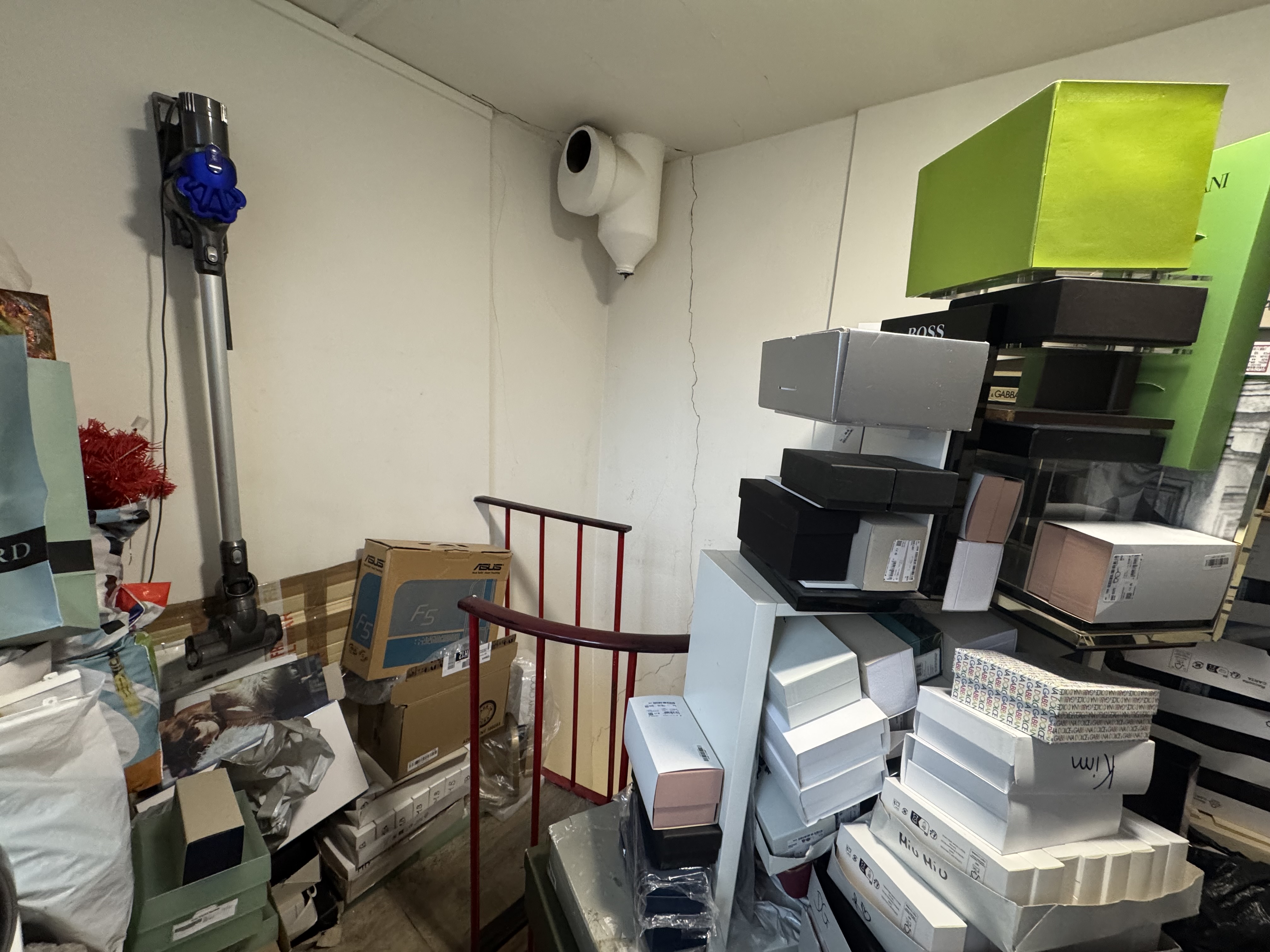 - en bas escalier, mettre un frigo, des armoires de rangement, porte balai, changement verou toilette
